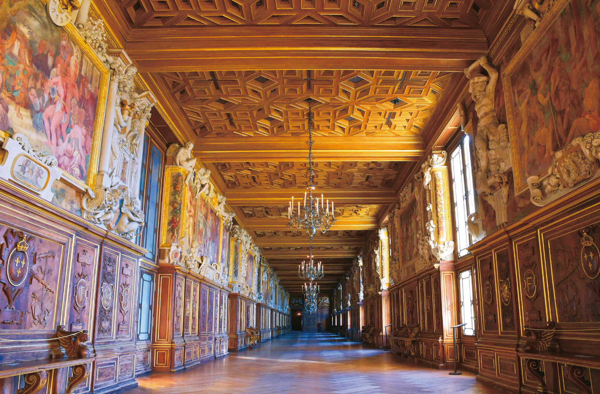 国王の熱望と芸術家たちの才により、宮殿は豪奢(ごうしゃ)に彩られていった。写真の黄金にきらめく「フランソワ1世の回廊」は、イタリア人の芸術家がフレスコ画や化粧漆喰などで装飾を施したルネッサンスの傑作だ。