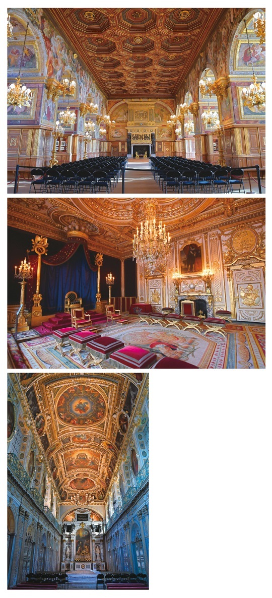 天井画や壁画が見事な「舞踏の間」。フランソワ1世が祝祭用に着工し、息子のアンリ2世の時代に完成(上)。