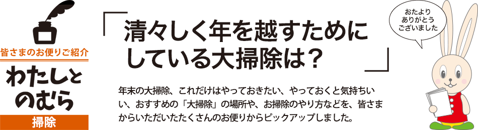 実は…我が家では年末大掃除はやっていません。衣替えの時期に合わせて春と秋に「中掃除」をします。年末は寒くて窓を開けるのが嫌だし、ほかにしないといけないことがたくさんありますから。それに衣替えの時にたんすやクローゼットも空っぽにして掃除できるのでいいですよ~。というわけで年末は家族で窓拭き。部屋の中の人と外の人に分かれて向かい合わせで拭くので楽しいです。