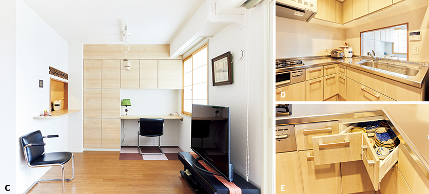 C リビング・ダイニング │ キッチンカウンターの前のダイニングスペースにはダイニングテーブルを置かず、代わりに壁一面の作り付けの棚と書斎コーナーを設けた。二重サッシの窓は、戸建てのイメージで、障子タイプの和風デザインを採用。D,E キッチン │ 機能的なシステムキッチンの引き出しを、日常使いの食器収納として利用。