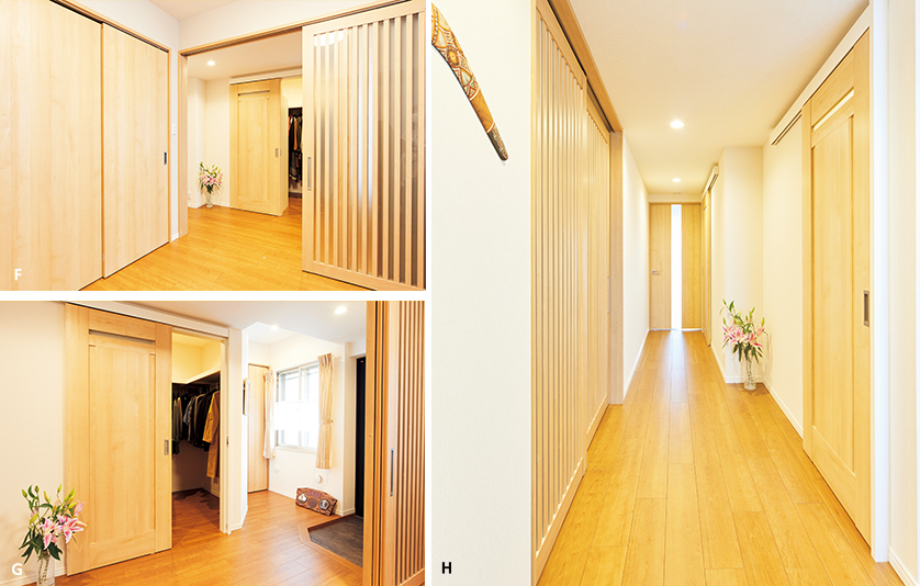 F 寝室 │ 玄関脇の寝室は「圧迫感を感じないように」というHさまのご要望で、すりガラスが入った格子戸風の引き戸に。G ウォークインクローゼット │ ハンガーパイプが壁2面に渡ってL字型に造作されていて大容量。すべての洋服をハンガーに吊して収納できるので衣替えも簡単。H 廊下 │ 廊下には玄関、寝室と同じ明るい色目の床材を採用。