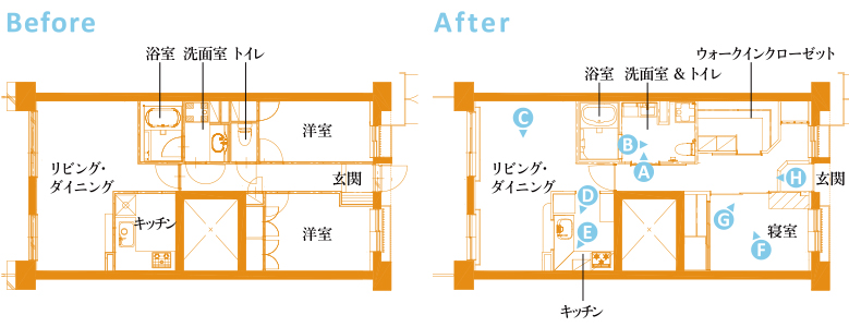 新築当時からお住まいの家で、歳を重ねて60代になり、増えすぎたものを捨てないと、ちょっとしたことでつまずいたり転んだりして危ないと感じるようになった。「車椅子になっても大丈夫なように、バリアフリーにしたいと考えました。それから古くなった設備を一新して、収納や造作家具を増やすことで、将来的に売ったり貸したりしやすい資産になるようにと思い、フルリフォームを決断しました」。使っていない洋室をつぶし、玄関ホールの拡張と大容量のウォークインクローゼットの設置に活用したのもそのためだ。洋室だった部屋の窓が玄関の一部になり自然光が入るようになって、絵画や花を飾るスペースもできたことから、玄関はすっかりHさまのお気に入りに。「お客さまからも、素敵になったねと言われます」。