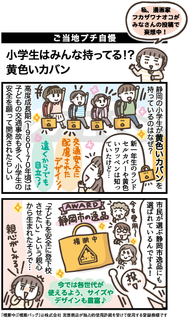 静岡市では新小学1年生全員に、黄色い「横断バッグ」が配布され、うちの子も愛用しています。児童の登下校時の交通安全のために開発された手さげ袋で、NPO団体からの寄付により長年、無料配布されているのだそうです。
