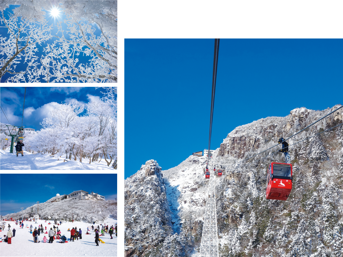 鈴鹿山脈のほぼ中央に位置する標高1,212mの御在所岳。気象条件が整うと出現する樹氷が、冬の見どころです。通年営業の御在所ロープウエイと観光リフトで、山頂まで簡単にアクセスできます。山頂には景色を眺望しながら食事ができるレストランも併設。